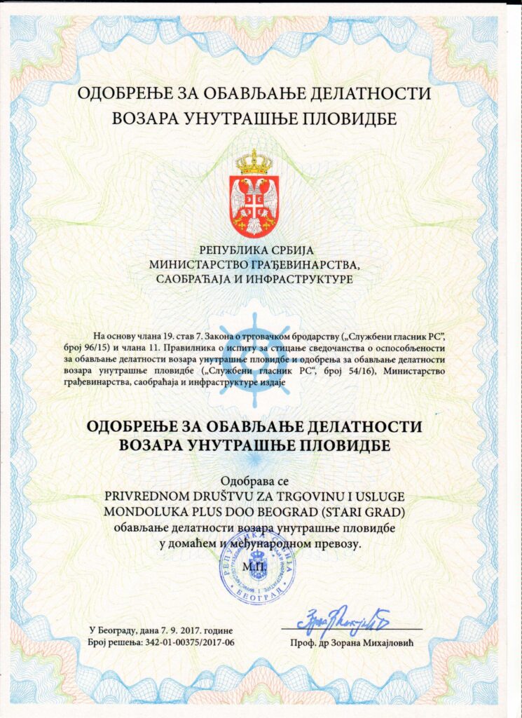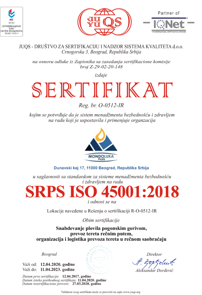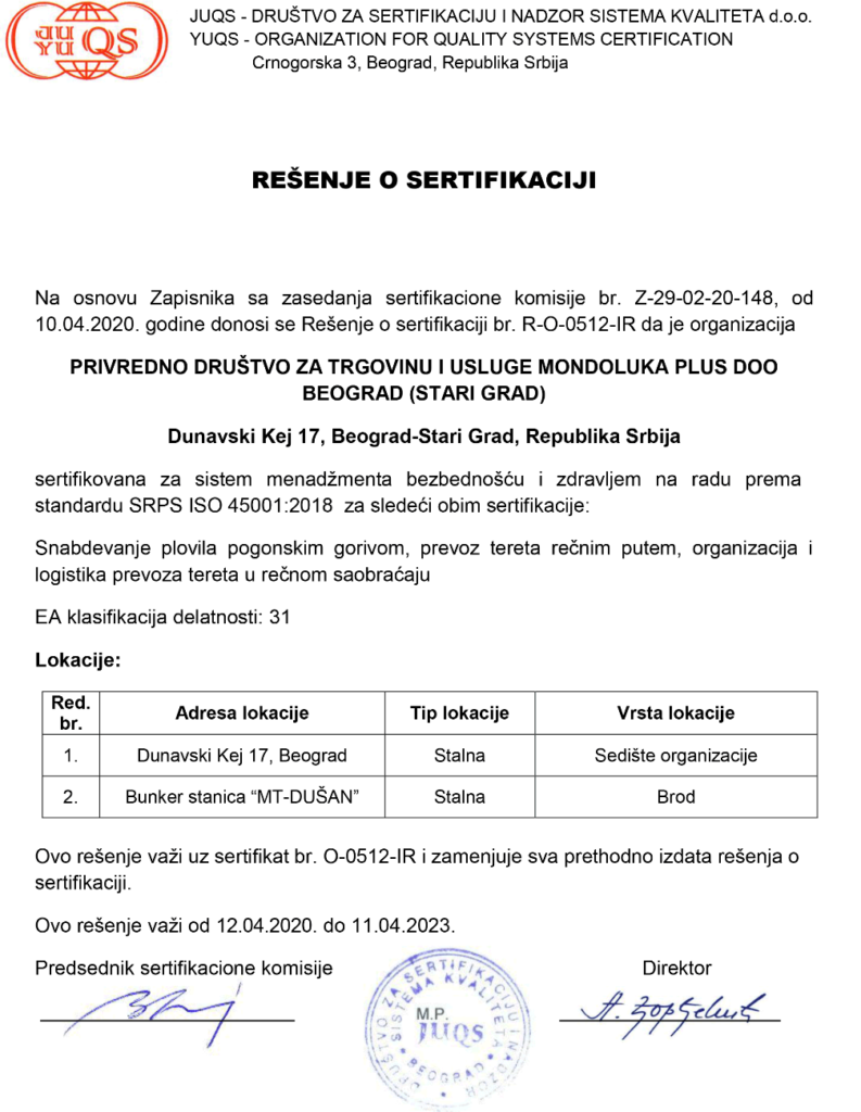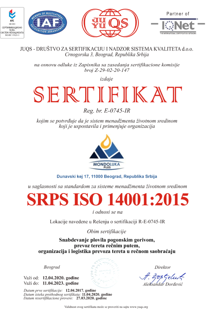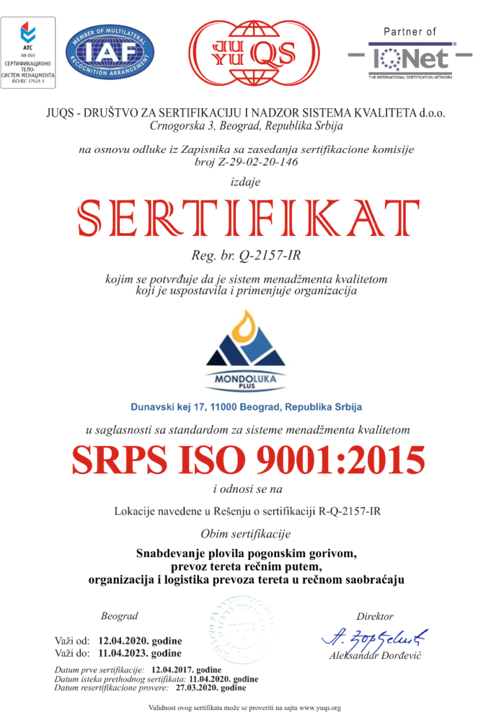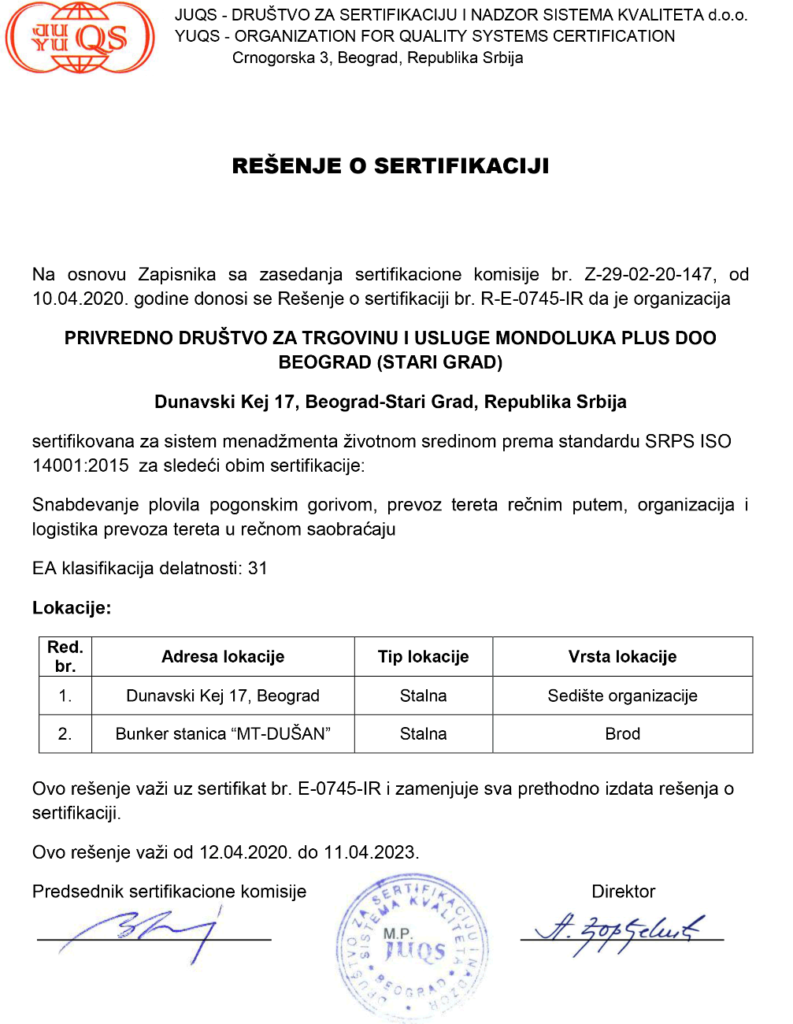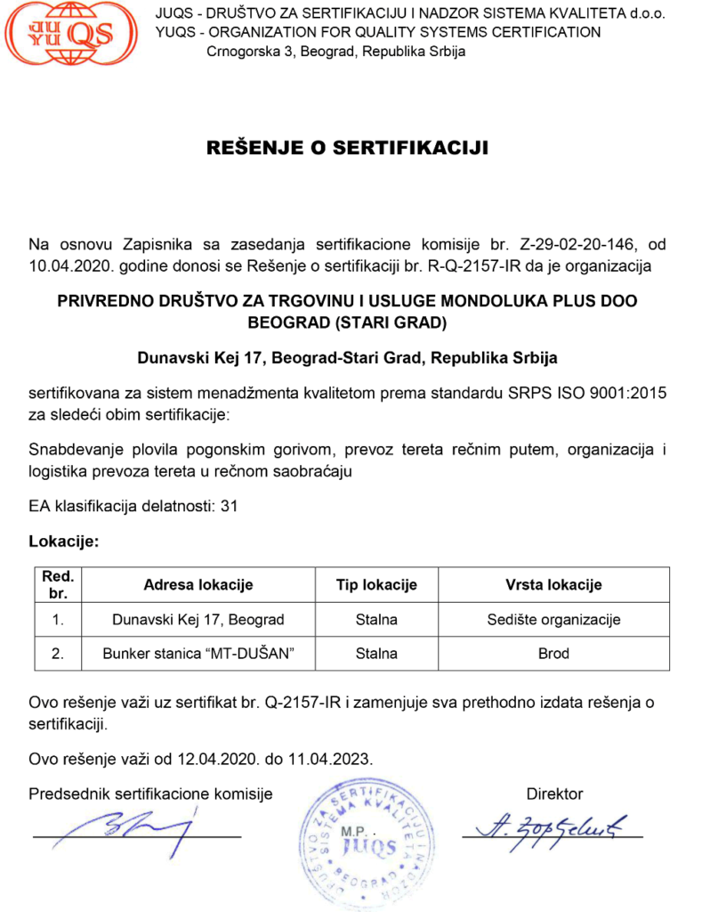 Kompanija Mondoluka plus d.o.o. je u aprilu mesecu 2017.godine usvojila Integrisani menadžment sistem i stekla Sertifikate za sledeće sisteme: